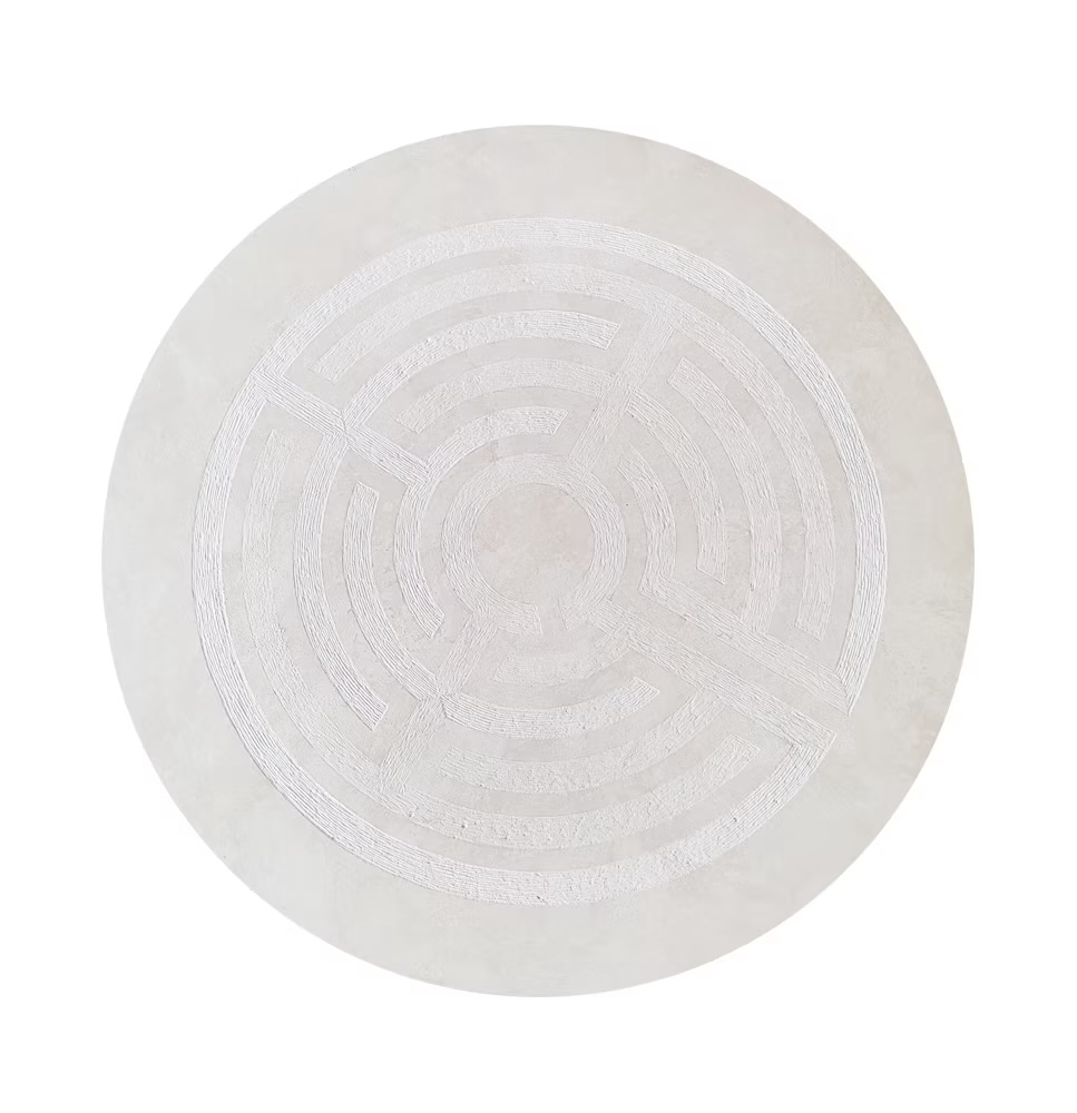 The Labirintico Bianco design is defined by delicate, interwoven lines that evoke the complexity of a labyrinth, yet rendered in pure light tones. The surface plays with contrasts between ivory, soft greys, and subtle shadows, producing an effect that is simultaneously ordered and organic. Under varying light, the table shifts its presence, appearing both minimal and richly textured, depending on the viewer’s perspective.