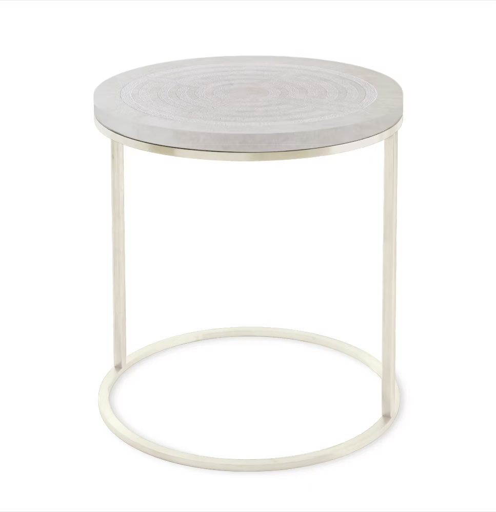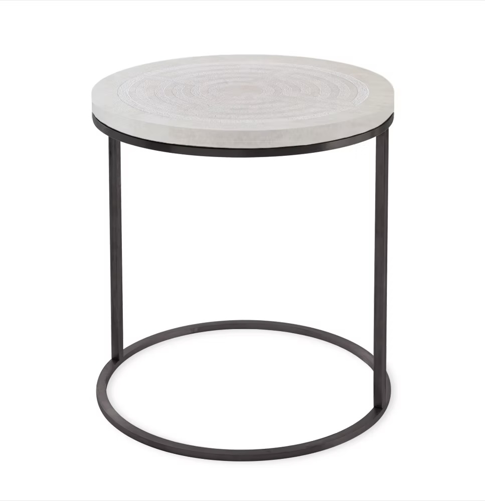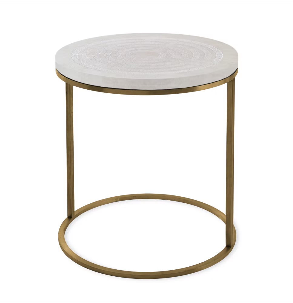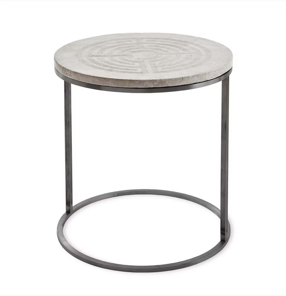 Functionality complements its artistry. The table is available in a 45 cm diameter, compact and elegant for both intimate and refined spaces. The pedestal base can be customized in three options: 30 cm, 40 cm, or no legs, ensuring adaptability to different settings. The metal base comes in Black, Brass, Iron, or White, offering the possibility to either create bold contrasts or maintain harmony with the soft white labyrinth surface.
