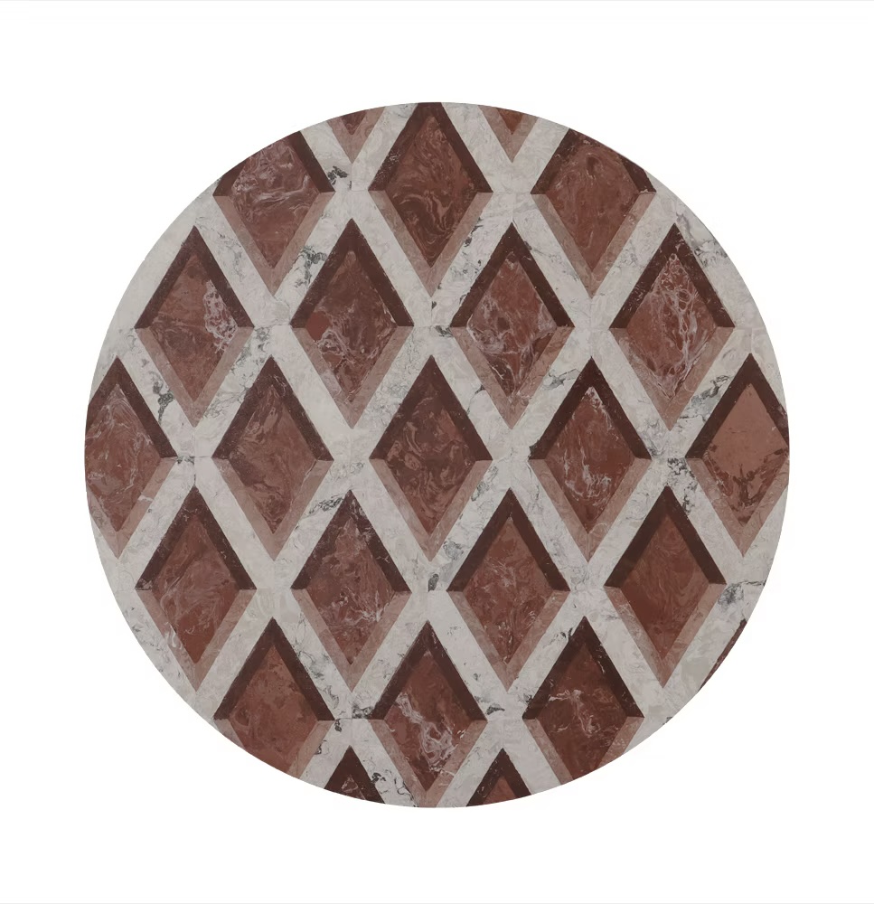 A prima vista, il motivo Losanghe si rivela come un gioco di precisione ed eleganza. Ogni rombo è disposto con cura, ciascuno cattura la luce in modo unico, producendo un effetto mutevole che cambia durante il giorno. La superficie in scagliola fonde pigmenti terrosi, delicati grigi e sfumature avorio in una palette sofisticata. Da ogni prospettiva, il tavolo appare vivo, come se la geometria stessa si trasformasse in scultura.